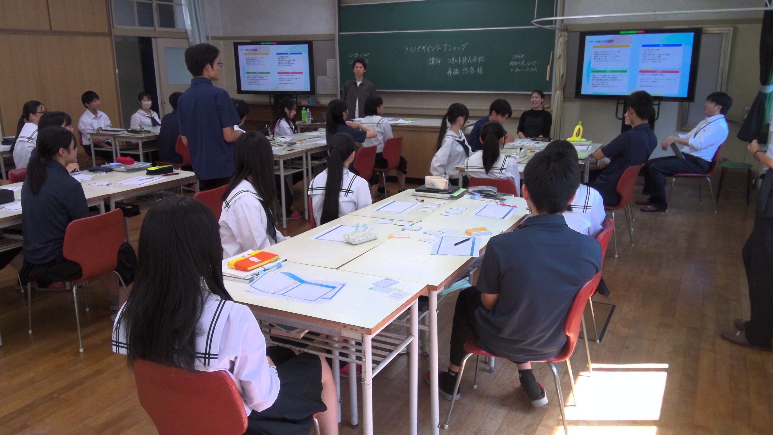 10月6日(月)3,4限の生活科学(家庭科)の授業で、コネヒト(株)の森脇悠登様を講師としてお迎えし、ライフデザインワークショップを実施しました。前半はライフデザインに関する知識を学習した後、ライフデザインカードを用いながらライフプランの作成を行いました。後半は、実際に子育て中の方を授業に招き、仕事と日常生活や子育てや健康管理等に関してインタビュー形式でヒアリングを行いました。将来のライフプランに対して、考えを深めることができました。