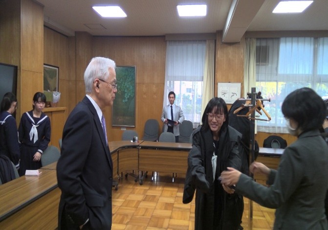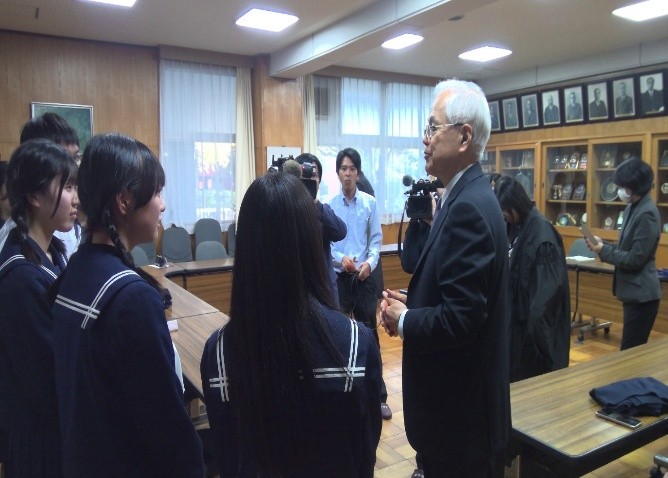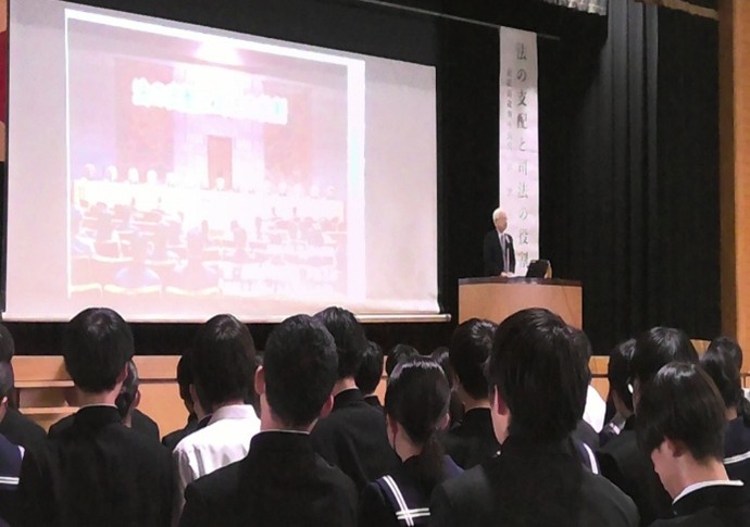 11月17日7限目に、全校生徒・希望した保護者・学校関係者を対象に人権教育講演会が行われ、第20代最高裁判所長官をつとめられ、今年秋の叙勲で桐花大綬章を受章された、本校卒業生の戸倉三郎氏が講演されました。『法の支配と司法の役割』と題して、ご自分の経験も踏まえ、具体例を挙げながら法の支配や人権の保障、裁判所の役割について話され、生徒も偉大な先輩の憲法の番人としてのご活躍を興味深く聞いていました。講演後、生徒たちは、戸倉先生ご自身の法服を着用させていただき、質問をしたり、一緒に写真も撮っていただいたりしていました。多くの示唆に富んだお話で、翌日からの学校生活に向けてエールをいただきました。