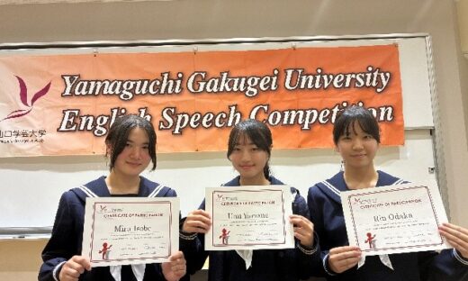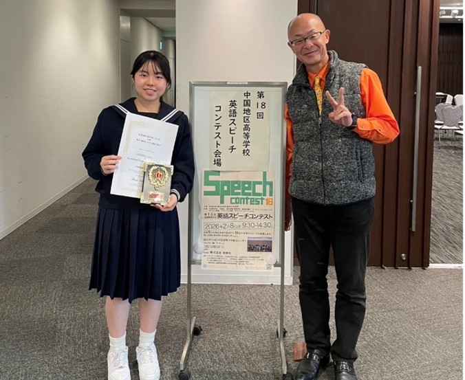 11月22日(土)、下松市のほしらんどくだまつで第18回中国高等学校英語スピーチ大会が開催され2年の弘中南歩さんが見事3位に入賞しました。自身のカンボジア研修で体験した発展途上国の現状視察を踏まえ、教育の重要性を説いた素晴らしい内容のスピーチに聴衆はくぎ付けになりました。ジャッジからも高い評価を受けましたが、2位までに与えられる全国大会への切符は惜しくも逃しました。しかし、この貴重な経験をさらなる成長につなげていくとともに、全国大会出場という目標の実現をめざす後輩に最高のバトンを渡すことができました。スピーチの様子は以下のURLからどうぞ。