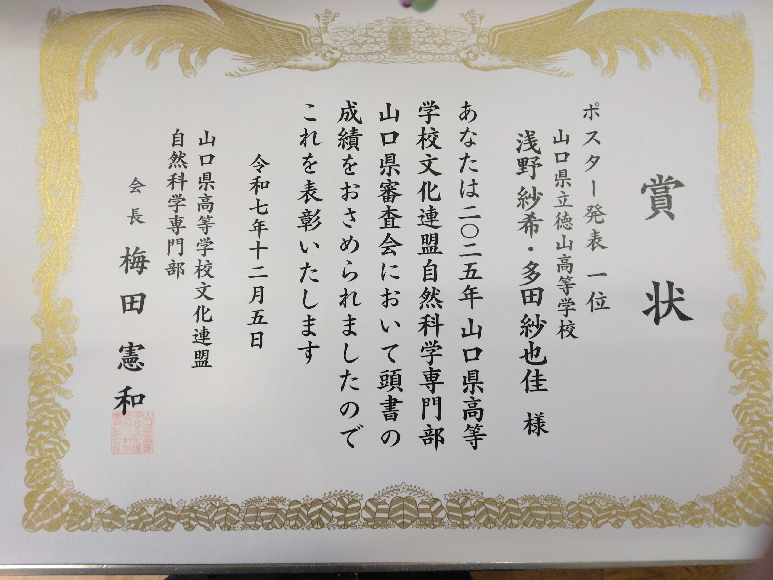 2025年山口県高等学校文化連盟自然科学専門部山口審査会から賞状が届きました。