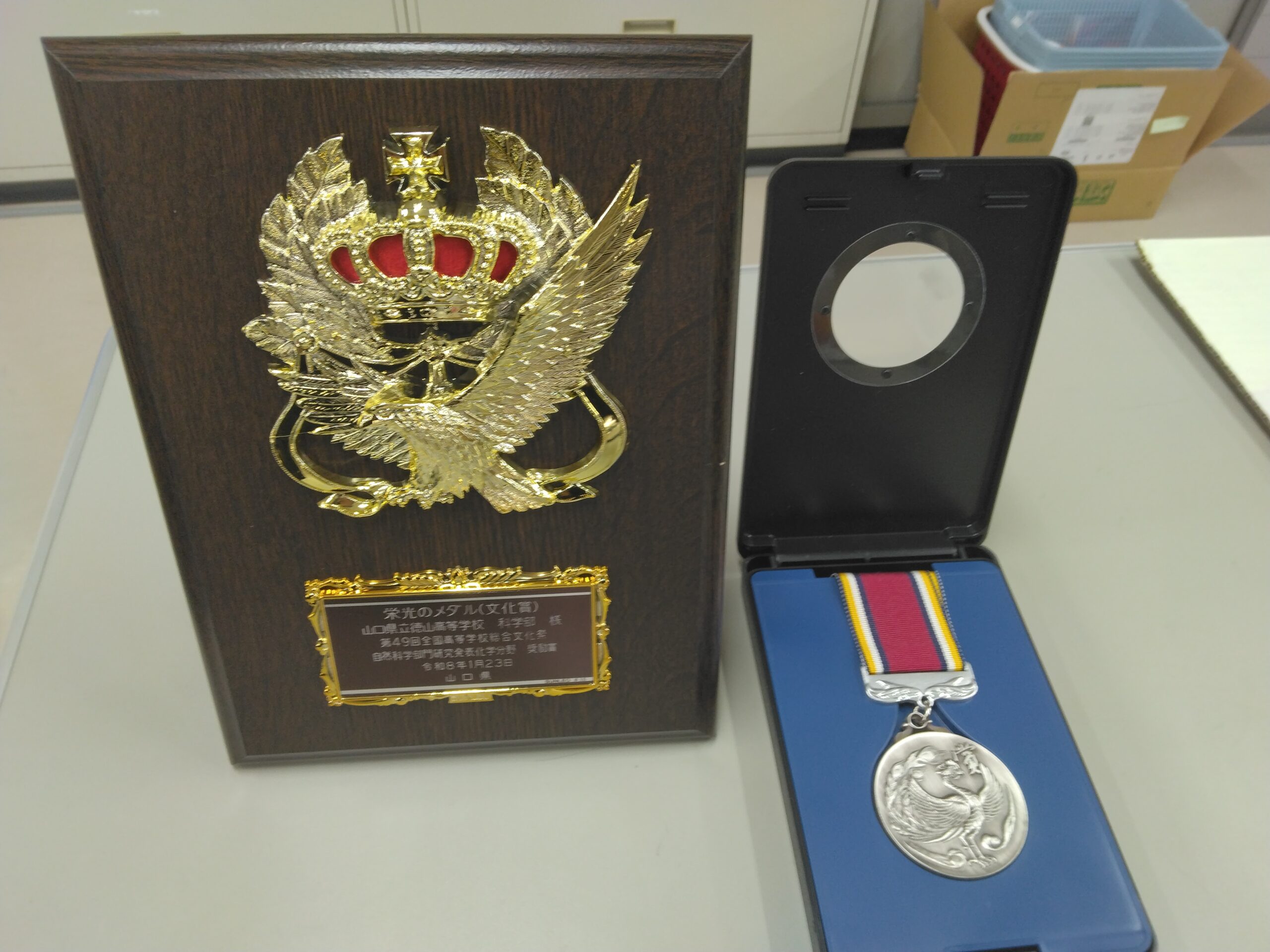 2月27日(金)卒業式前日の賞状授与式にて,科学部松永七海さんと堤康稀君が,栄光のメダルを授与されました。栄光のメダルとは文化・スポーツの各分野における全国規模の大会等において、優秀な成績を収めた個人(メダル)又は団体(盾)に山口県から授与されるものです。受賞理由は以下の通りです。